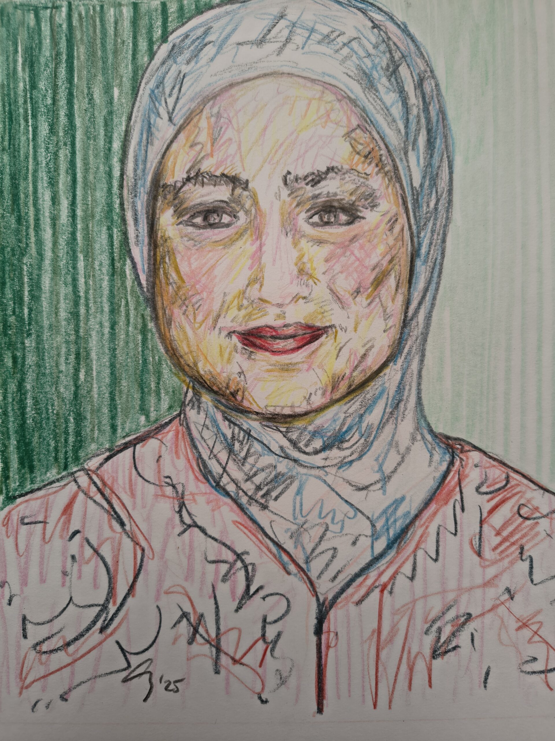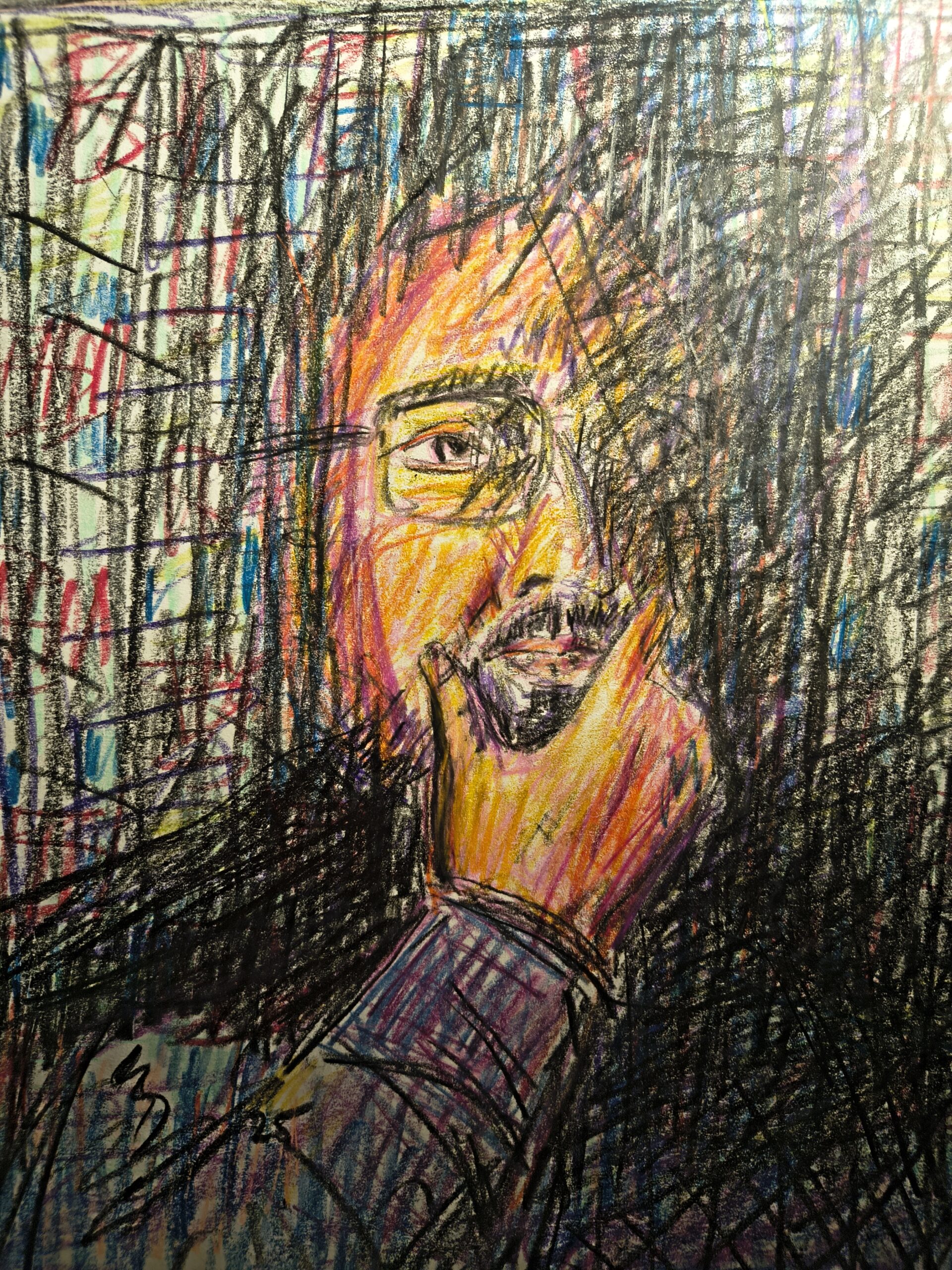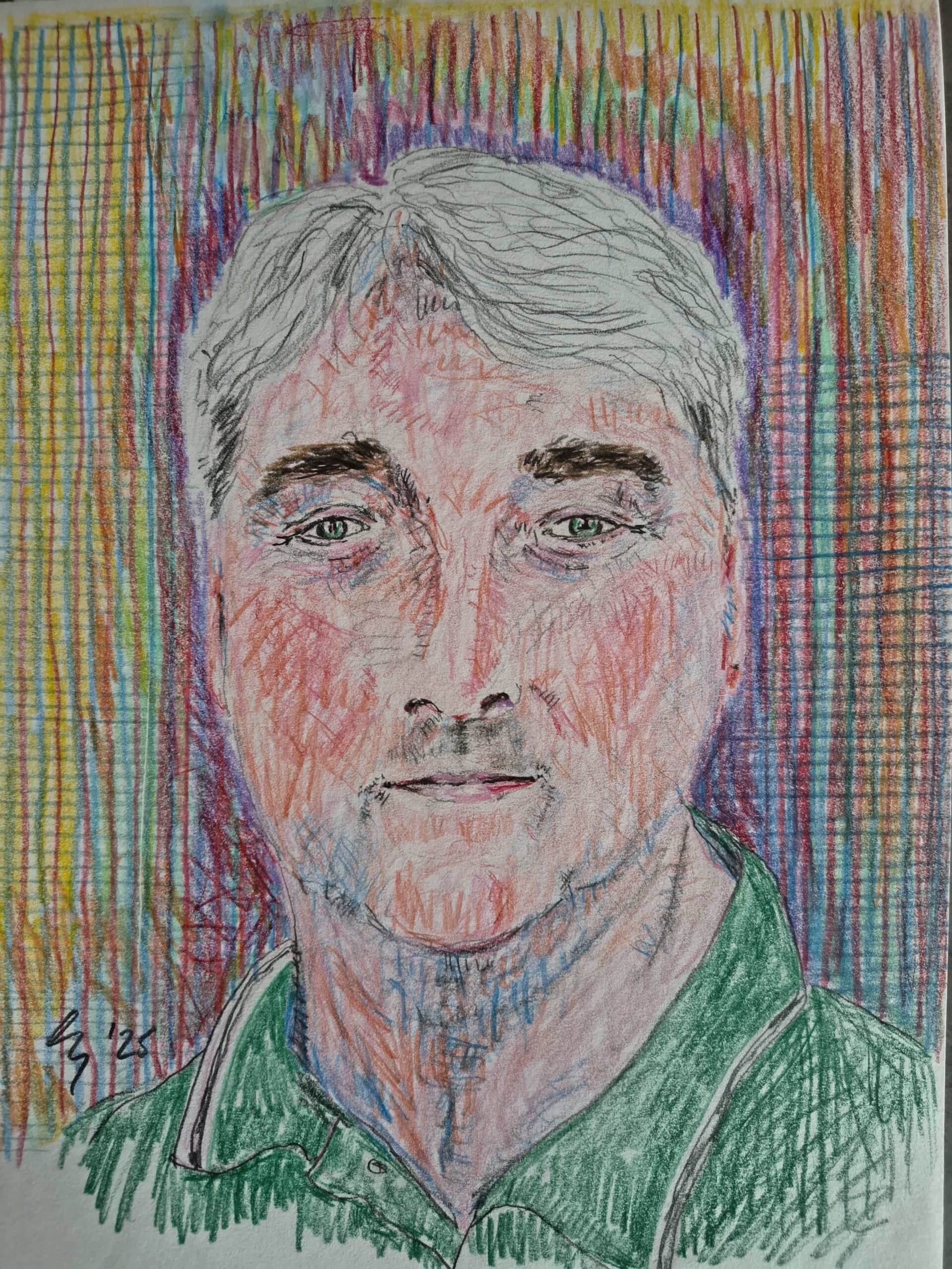 Vonkjes van wereldburgerschap en co-cratie – het verzoek of hij een portret zou willen tekenen voor de podcast met Dirk de Wachter paktijk Greg op als een nieuwe uitdaging met een serie portretten van de QfWf-Kring…