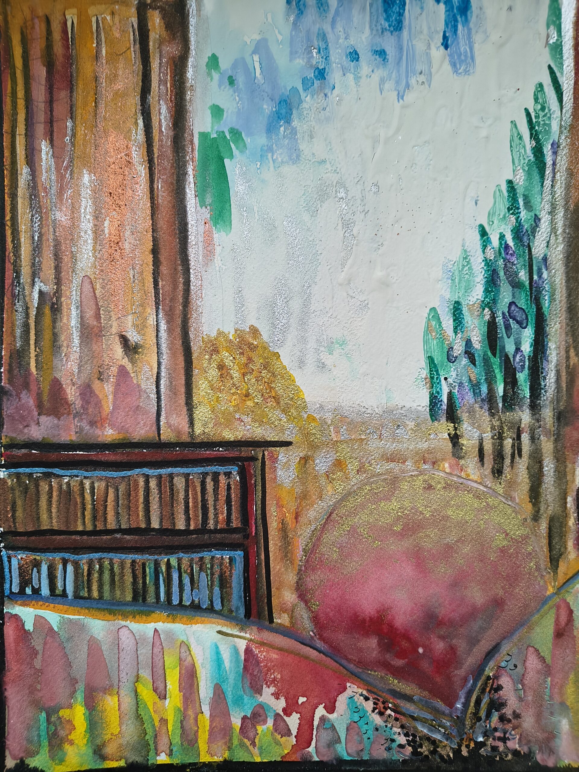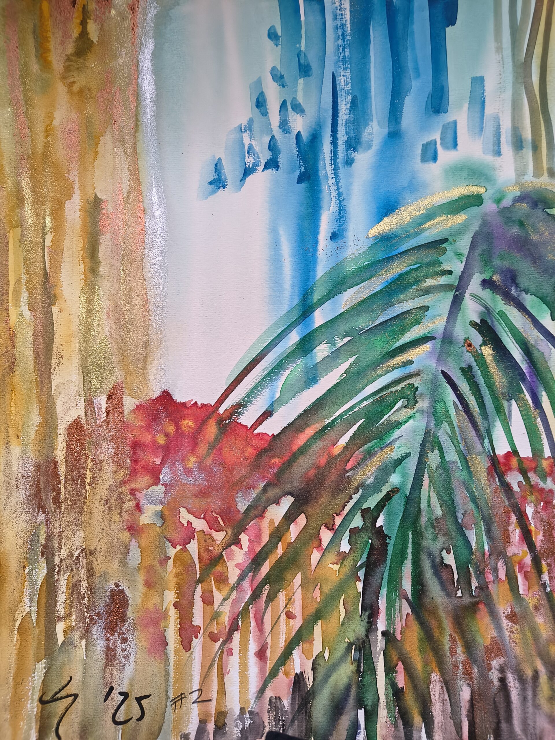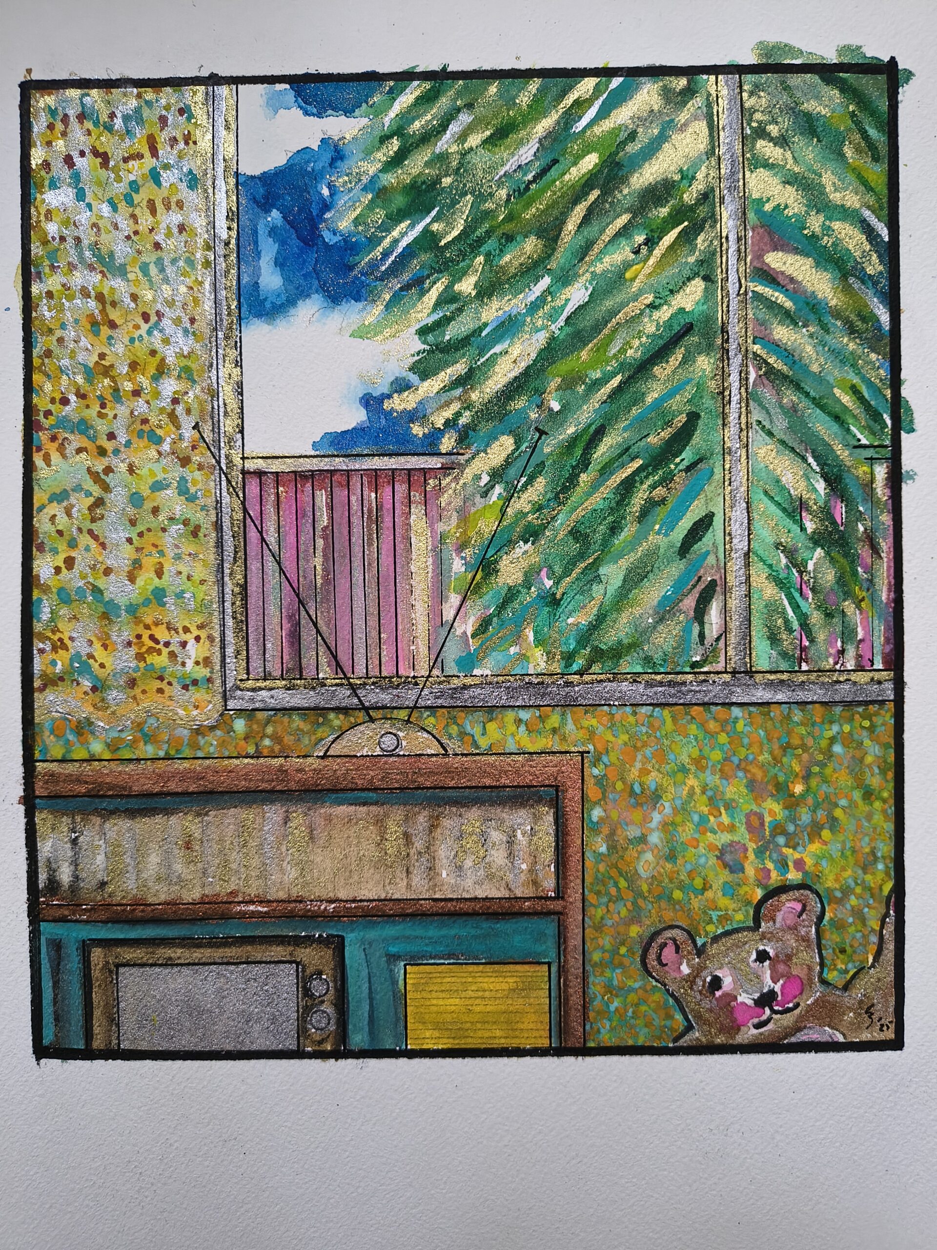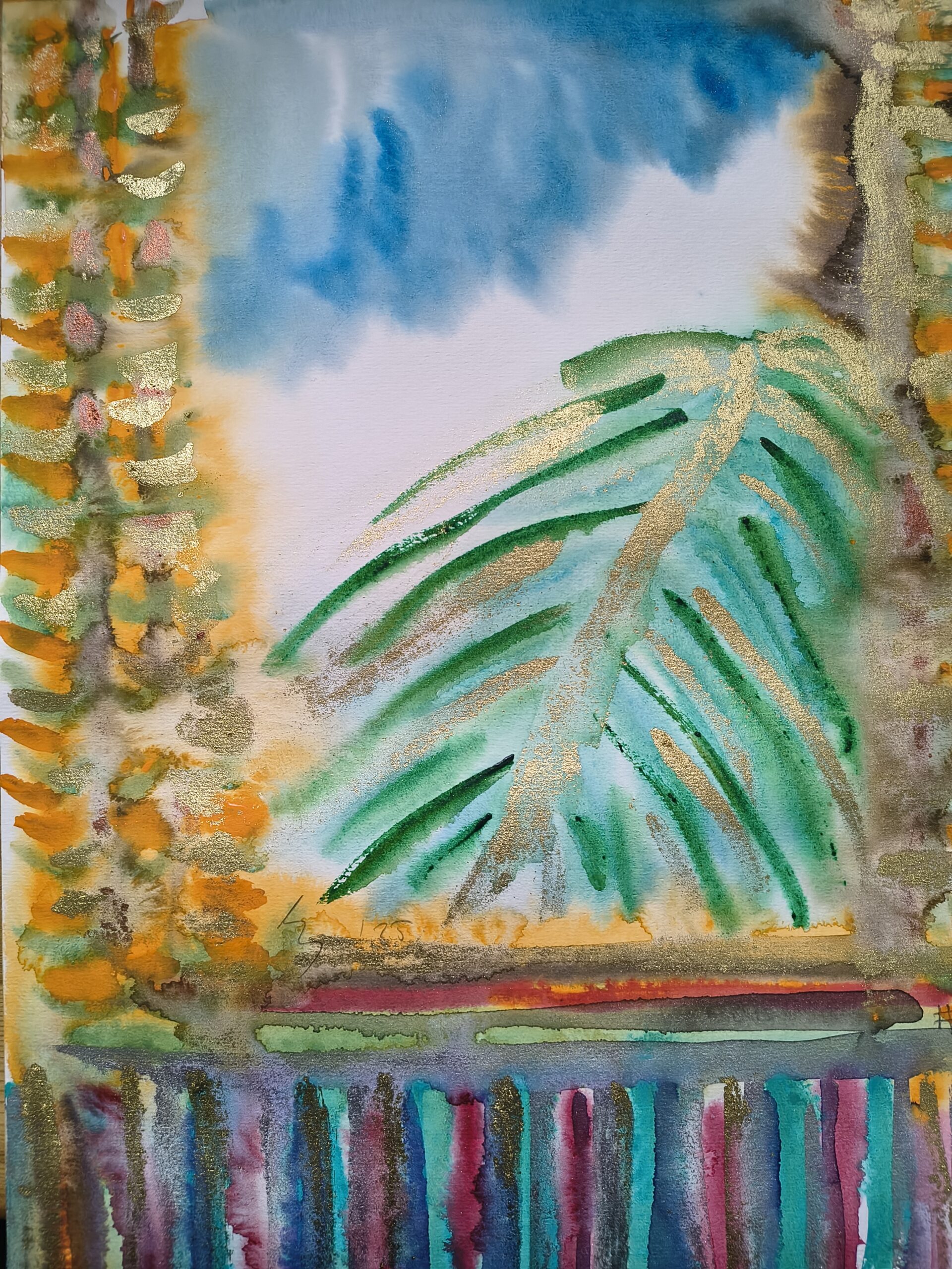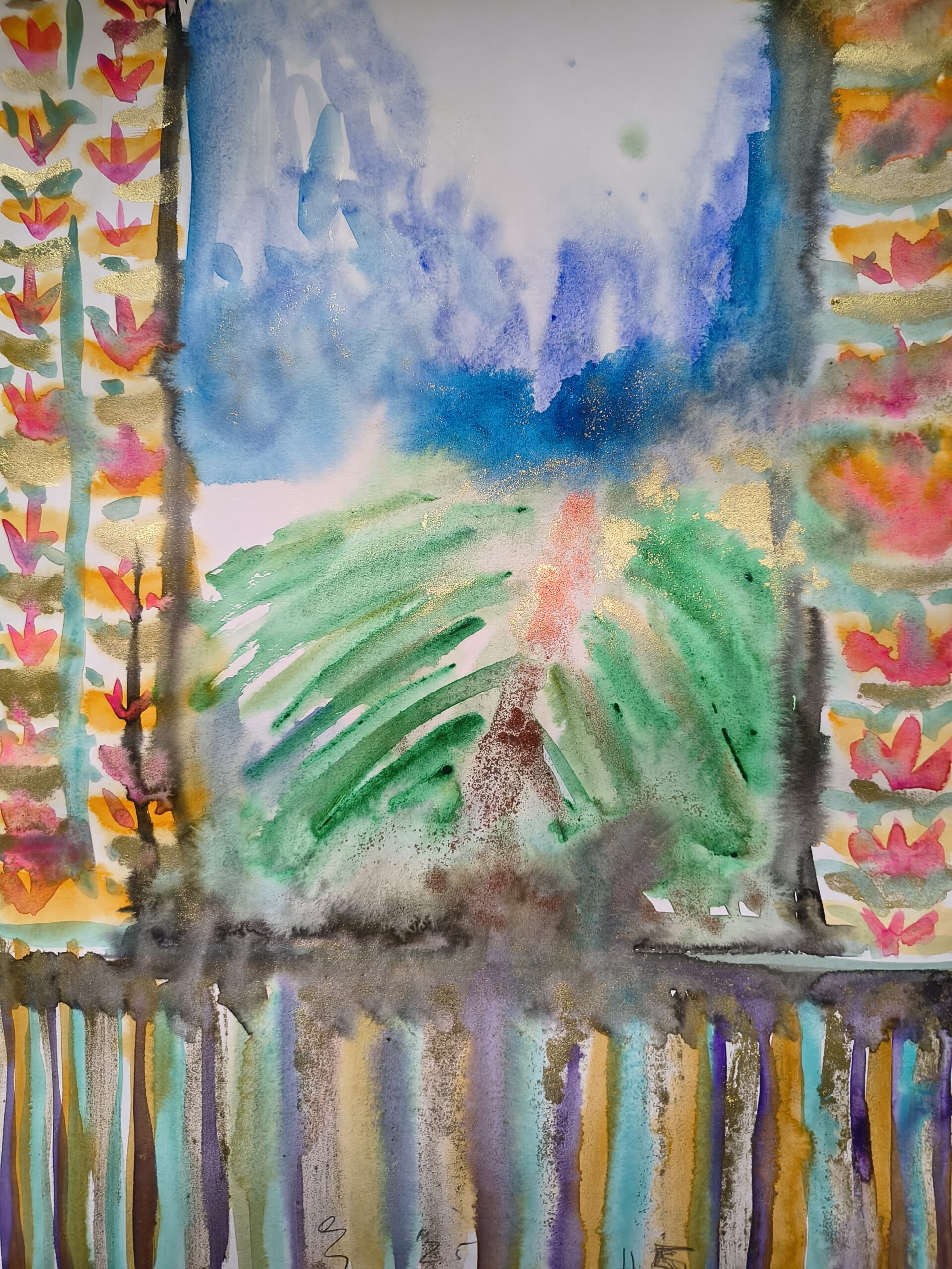 “This week’s 3 aquarelles take an increasingly abstract turn as I try to look at color, pattern, movement and composition as a way of expressing a memory, which is also rather abstract, or, becomes increasingly abstract the more you try to focus on it. This reminds me of the Buddhist concept of emptiness, or the ‘unfindability’ of any object. For example, the more you look for your own “I”, the more you conclude that you are not one specific thing, but many. Dissecting a memory has been trying to find the elements that comprise the memory… As I go more abstract, it’s the emotions attached to the memory and objects, like the tv, the curtains, the palm trees or the stack of yellow National Geographic magazines I’m trying to capture. Also a sense of movement and ‘unreality’, like a dream, fluid and changeable…. That combining these ingredients and elements in this way reflects the dream-like quality of our memories. In fact, I’m finding that the more abstract I go, the closer I get to capturing a bit more of what I’m trying to express…. At least that’s my feeling!